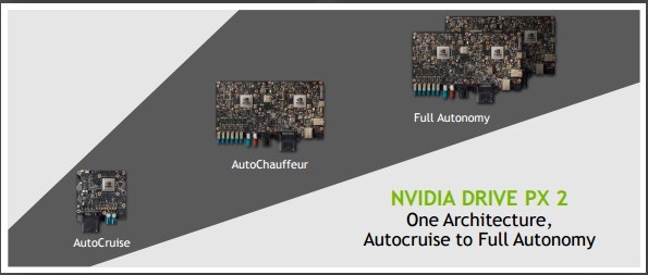 Additionally, DRIVE PX2 has a scalable architecture. This means that it can either be used in a lower configuration that consumes less power to deploy select autonomous functions, or it can enable full autonomous driving by using multiple DRIVE PX2 platforms.
