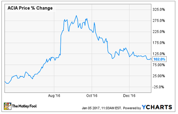 Acacia provides high-speed interconnection products across the world, for long-haul, metro, and data markets. The company just went pubic in May of last year, and so far, it's delivered a 102% return for initial investors.