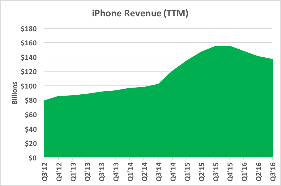 The next few don't go as far back, since Apple has changed its financial reporting a couple of times over the years (which breaks financial continuity). On a trailing-12-month basis, the iPhone became a $150 billion business in 2015. With the iPhone stalling in 2016, this figure has come down to "just" $137 billion. (The iPhone alone would rank as No. 12 on the Fortune 500.) Compare that to the $2.5 billion in revenue that the iPhone generated in its first year on the market (although Apple was required to account for iPhone sales under subscription accounting back then, stretching out revenue recognition).
