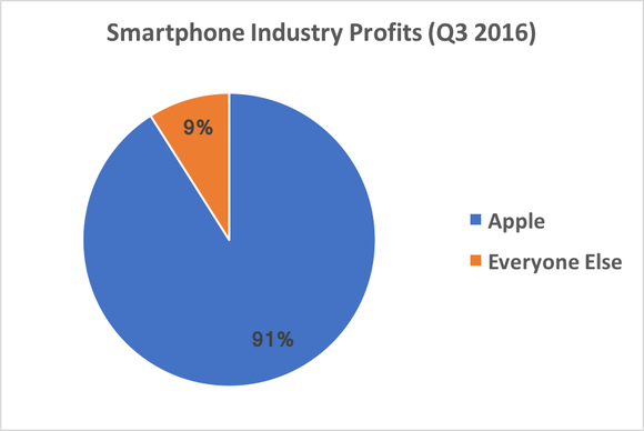 A couple of months ago, Strategy Analytics estimated that the smartphone industry collectively generated $9.4 billion in operating profits in the third quarter. Of that pie, Apple bagged a staggering 91% of the industry's profit, thanks largely to its superior pricing power. It also helps that Apple's scale affords it better leverage when negotiating component pricing, helping to reduce costs. Other estimates actually peg Apple's proportion of industry profits at over 100%, since most other companies' smartphone operations only generate losses.