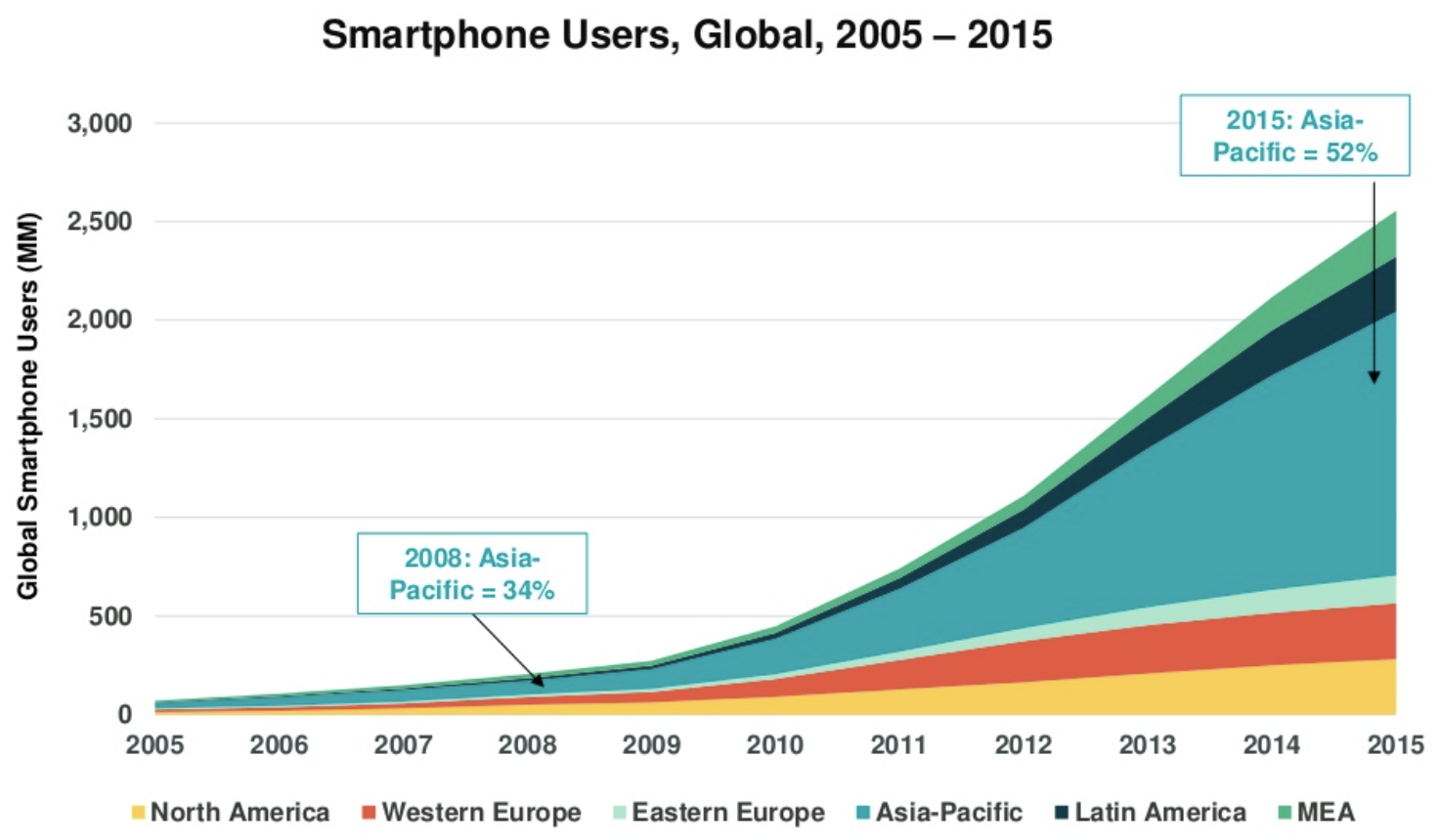 Before the iPhone, smartphones were a luxury relegated to the enterprise or high-end power users. The iPhone made smartphones approachable and easy to use, spurring mainstream consumer adoption. There are now over 2.5 billion smartphone users worldwide, according to KPCB's Mary Meeker.