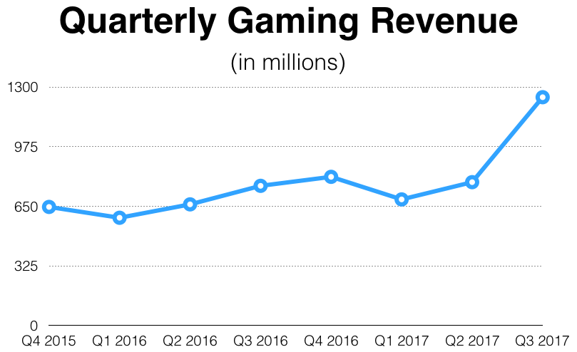 NVIDIA's gaming revenue is clearly moving in the right direction. The spike in the most recent quarter came primarily from its expanded line of Pascal-based GPUs, and the company's new graphics cards for the notebook market.