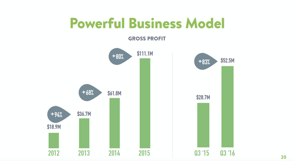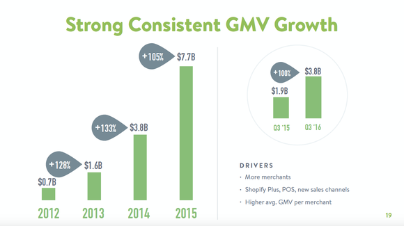 GMV for the third quarter of 2016 was $3.8 billion, an increase of 100% over the third quarter of 2015. Merchant solutions revenue was $49.7 million, an increase of 115%. The fact that revenue in this category is growing more than volume shows Shopify is succeeding at helping merchants sell goods and becoming more efficient while doing so -- two great trends.