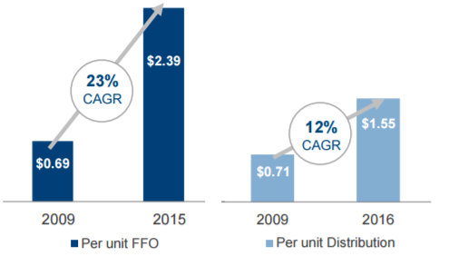 Brookfield's business model of acquiring stable infrastructure assets has been wildly successful over the past several years. As this slide shows, the company has grown its earnings and dividend by double-digit rates since going public in 2009: