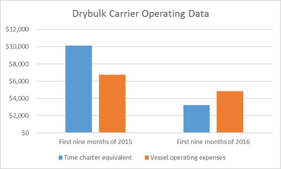 Data source: DryShips Inc. Chart by author. Both time charter equivalent and vessel operating expenses represent average daily rates per ship.