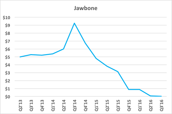 Jawbone has been in financial turmoil for the past couple of years, laying off 15% of its staff a year ago. The company has also had trouble paying NexRep, the customer service agency it had previously worked with. Once upon a time, Jawbone was valued at $1.5 billion. That was the most recent private valuation from January 2016, when the company raised $165 million in a downround (when a funding round is done at a lower valuation than the prior funding round; in 2014, Jawbone fetched a $3 billion valuation).
