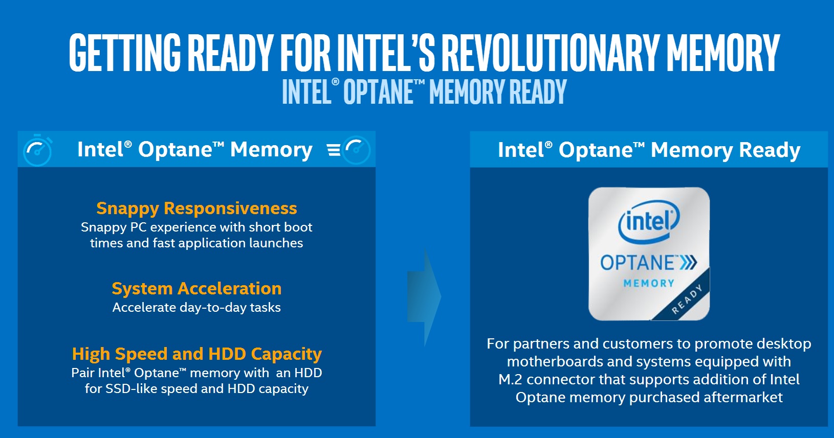 Intel's marketing pitch for Optane is simple: a small Optane-based solid state drive can be installed into a system alongside a traditional hard disk drive to deliver "[solid state drive]-like speed and [hard disk drive] capacity."