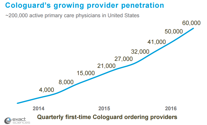 The next hurdle is making healthcare providers aware of Cologuard's benefits. Conroy showed a chart that reflected Exact Sciences' progress.