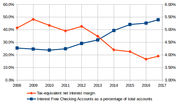 After the recession, BMRC's net interest margin decreased an entire percent. Since 2014, the reduction in NIM has slowed considerably. This timeline corresponds with the graph of interest free checking accounts from earlier.