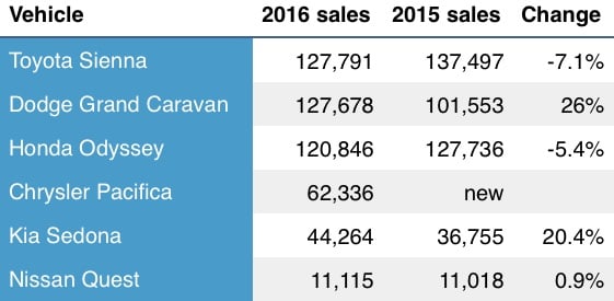 Clearly, FCA and Toyota are Honda's biggest rivals in the still-significant minivan market. What's interesting is that the two biggest sellers, the Dodge Grand Caravan and Toyota Sienna, are dated models, both older than the outgoing Odyssey. (The Chrysler Pacifica was all new in 2016. It's expected to eventually replace the Grand Caravan, but for now the Dodge remains in production.)