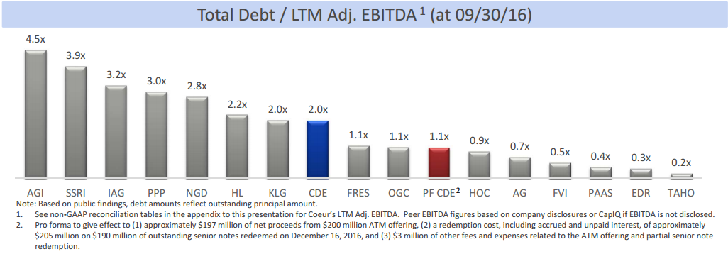 Coeur's debt is getting better, but it's still not at the low end of its peer group. Image source: Coeur Mining Inc.