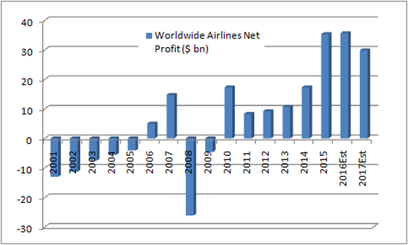 First, Immelt took over on Sep 7, 2001. You probably don't need a reminder of what happened four days later. It did no favors to the company's aircraft engine sales, and as you can see below, the worldwide airline industry was only profitable in two years of the decade.