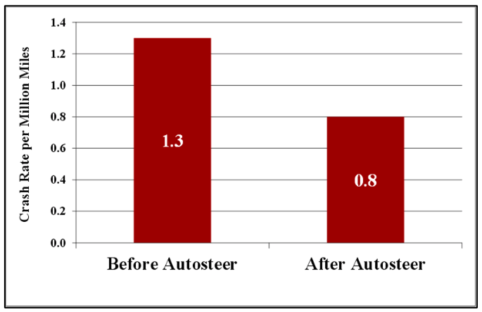 2. The crash rate for Tesla Autopilot-equipped vehicles dropped about 40% compared to vehicles without the technology, according to NHTSA's analysis of mileage and airbag deployment for Tesla vehicles.