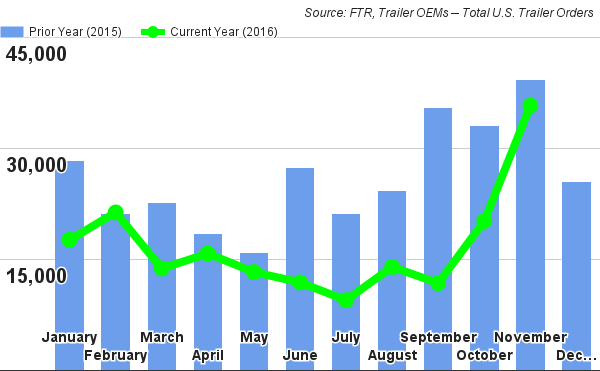 While truck tonnage was unusually volatile in 2016, the American Trucking Association expects overall freight volumes to improve this year, backed by strong housing and retail markets. The Trump administration's boost to manufacturing could further fuel the freight markets. In fact, reports from leading freight transportation analyst company FTR reveal a dramatic jump in trailer orders in the U.S. since September, suggesting that a turnaround may already be under way.