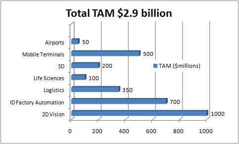 Cognex's CFO Richard Morin recently outlined the company's TAM at the Needham Growth Conference, the key points of which you'll see in a moment. For reference, Cognex's trailing yearly revenue is only $489 million, meaning Cognex is selling into less than 17% of its TAM. Given that it's the leading player in highly fragmented machine-vision marketplace -- Japanese rival Keyence is a company nearly eight times larger but sells less into this particular market -- Cognex clearly has plenty of growth potential.