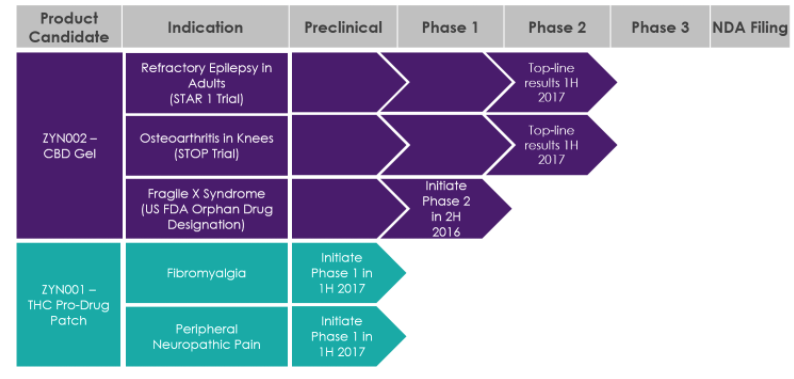 Zynerba said that the proceeds of the deal will be used to fund the clinical development its two transdermal synthetic cannabinoid product candidates -- which are called ZYN002 and ZYN001 -- as well as for general corporate purposes.