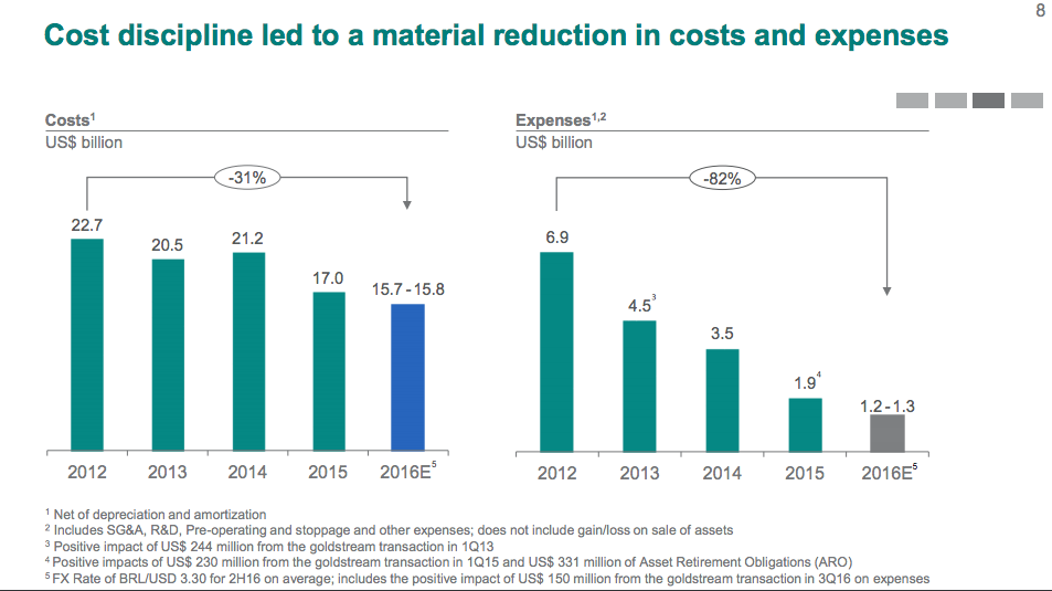Vale, on the other hand, has to deal with volatile commodity prices and the risks inherent to mining. Samarco is proof of the largest risks, but a lesser risk is the cyclical nature of mining costs. Right now Vale's costs look like they are heading lower as it completes its massive S11D iron ore project. But the fact that Vale was able to reduce its costs by 31% between 2012 and 2016 shows that costs can get out of hand if they aren't strictly controlled. That's hard to do when times are flush, like they were in the years leading up to the commodity peak in 2011.