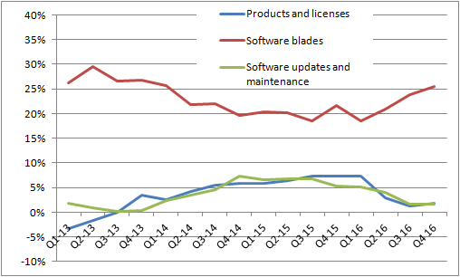 First, CFO Tal Payne said the company achieved "double-digit growth in our core appliances with strong transition to our new product family launched earlier this year. This quarter, over 85% of our appliances business comes from the new family." As you can see below, product revenue (36% of total revenue) and software blade subscriptions (23%) increased their growth rates in the quarter, indicating success in expanding the customer base. This could be thanks to sales spurred by the new product family.