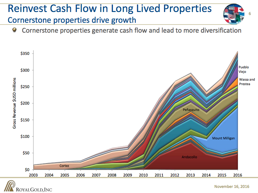 Mount Milligan mine reached full capacity in 2015. In fiscal 2016, the mine contributed roughly a third of Royal Gold's revenue. With a 20-year mine life, and potential opportunities for increasing production, this is an important asset for Royal Gold.
