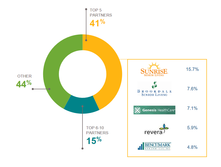 Welltower has a lot of joint ventures in its portfolio, and is highly reliant of a select group of tenants. In fact, the company's top five operating partners account for 41% of the portfolio's total income. Sunrise Senior Living (15.7%), Brookdale Senior Living (7.6%), and Genesis HealthCare (7.1%) are the largest, and if any of these companies ran into significant financial difficulties, it could send Welltower shares lower.