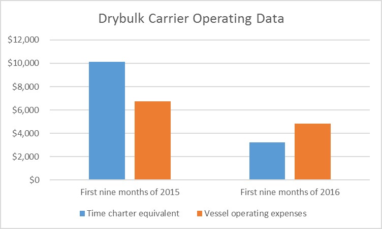 Driving DryShips' devastating collapse over the past few years is that it had amassed more than $5 billion of debt to grow its fleet, which became a grave issue when shipping rates collapsed. Last year, for example, the company lost money leasing its dry bulk vessels because shipping rates were below its operating costs: