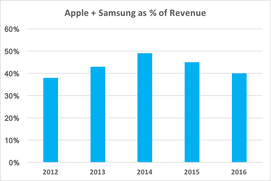 Combined with Samsung, Apple and its suppliers represented 40% of all of Qualcomm's revenue last fiscal year. That's actually down from the 49% of sales that the companies collectively represented in fiscal 2014.