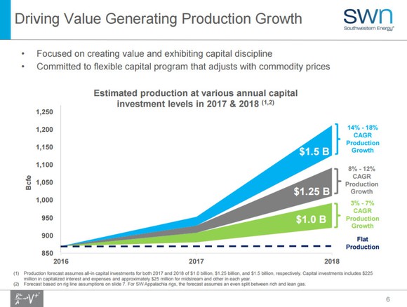 The high-end represents a robust growth rate for a company of its size. For perspective, the nation's second-largest gas producer, Chesapeake Energy (CHK +0.00%), sees its output rising 5% to 15% annually through 2020. Meanwhile, smaller rival Antero Resources expects to grow 20% to 25% this year, while delivering 20% to 22% annual growth from 2018 to 2020. However, that is off a lower production base of roughly 657 billions of cubic feet equivalent compared to 870 billions of cubic feet equivalent for Southwestern.