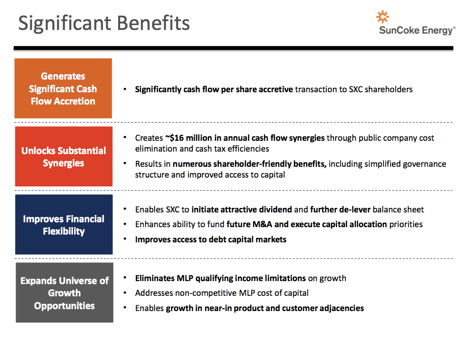 With the coal asset sale, SunCoke's business became a lot more stable. Then in late 2016, SunCoke Energy announced plans to buy SunCoke Energy Partners in an all-stock deal. That will bring the company's coking operations (SunCoke Energy) and its transportation assets (SunCoke Energy Partners) under one roof, simplifying the company's business materially. The deal is also expected to reduce expenses, increase SunCoke's cash flow, allow it to more aggressively reduce debt...and the company expects to initiate a dividend after the merger is completed. That's a long list of positives to look forward to in 2017, assuming the acquisition is approved.