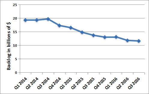 Caterpillar's backlog has declined rapidly in the past two years as new order rates slumped even as the company fulfilled orders in its backlog. There were no signs of a reversal yet, at least until the company's third quarter, when its backlog value declined 15% year over year to end at only about $11.6 billion. That's roughly the same percentage by which Caterpillar's revenue declined in Q3. You can see how Caterpillar's quarterly revenues have declined alongside backlog in the past couple of years: