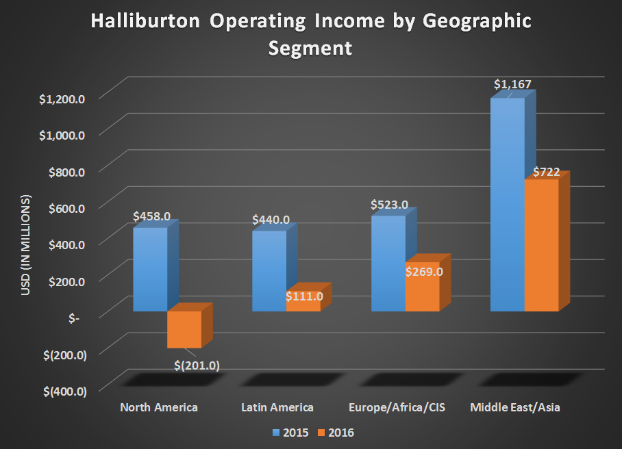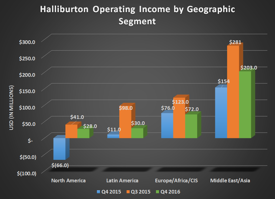 Among the year-end numbers, there isn't that much that pops out as extraordinary. Halliburton ended 2016 with a $6.69 per-share loss. Much of that loss, though, was the $7.4 billion in charges related to asset impairments, goodwill writedowns, and the $4.06 billion it had to charge for the termination of the merger with Baker Hughes (BHI +0.00%). So when looking at the company's year-end results, do keep in mind that those are heavily skewed by one-time items that probably won't have much of a material impact on the business in the coming year. Looking at operational income, we see that international markets held up rather well throughout the year, while the North American market suffered.