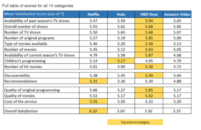 Both Netflix and HBO Now can stake a claim as having the top service, and Hulu made a strong case for third place, beating Netflix in six of 14 categories and scoring top marks in children's programming. Amazon Prime, however, consistently brought up the rear, ranking last in all 14 categories among the four services rated.