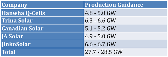 Canadian Solar Inc. (CSIQ +15.72%), Hanwha Q Cells Co Ltd (HQCL +0.00%), JA Solar Holdings Co., Ltd. (NASDAQ: JASO), JinkoSolar Holding Co., Ltd. (JKS +7.49%), and Trina Solar Limited (NYSE: TSL) are the five biggest manufacturers, and depending on where they end the year, they could produce 41% of the world's solar panels.