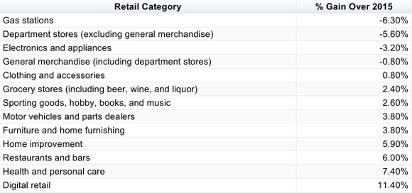 The big winners on the year were internet retailers, health and personal care stores, and restaurants and bars. The biggest losers were gas stations, department stores, and electronics and appliance stores. Here is a breakdown of how retail did on the year by major category.
