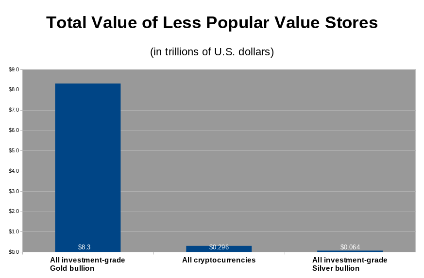 The stock and bond markets make the others look tiny. Let's zoom in on the precious metals and cryptocurrencies alone: