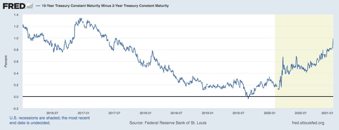 The yield on the 10-year note has increased to above 1.1%, while the yield on the two-year note has stayed flat below 0.10%. As you can see in the chart below, this has pushed the spread between these two rates as high as it's been since mid-2017.