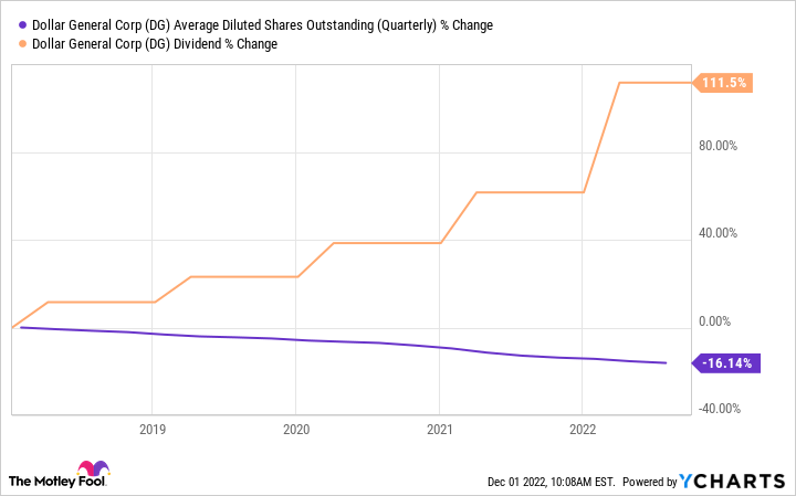 However, more than growth, Dollar General is at the stage of its business lifecycle where it's turned its attention to shareholder returns. As the chart below shows, the number of shares outstanding is dropping rapidly as management repurchases shares. And the dividend is trending significantly higher as well.