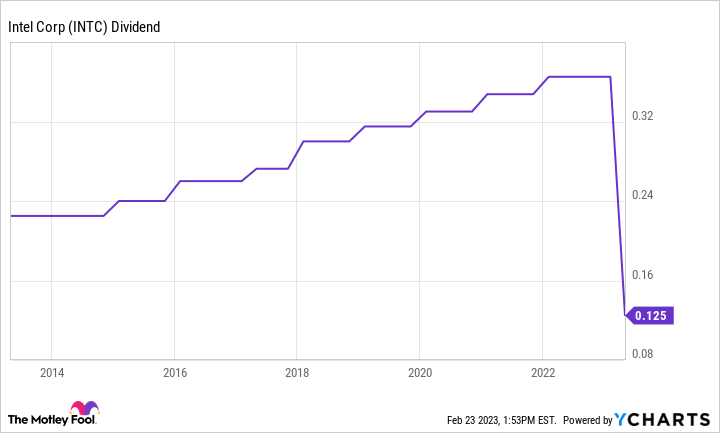 Intel (INTC 4.30%) recently revealed that it's resetting its dividend policy. The semiconductor giant is cutting its quarterly payout by 66% to $0.125 per share. That reduction ended years of steady growth for the dividend.