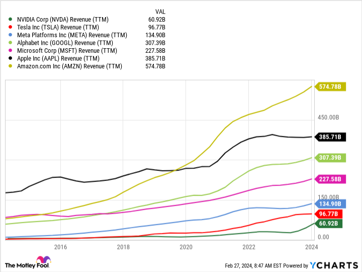 Nvidia (NVDA 3.27%) keeps going from strength to strength. It passed up mighty Alphabet and Amazon to become the third-most-valuable "Magnificent Seven" stock, and it briefly topped a $2 trillion market cap valuation. And yet, though it's the third largest business of the Magnificent Seven by market cap, it's still the smallest as measured by annual sales.