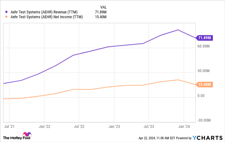 The good news for Aehr is that it appears it will remain profitable even during the EV downturn. It expects generally accepted accounting principles (GAAP) net income to be at least $11 million for fiscal 2024.