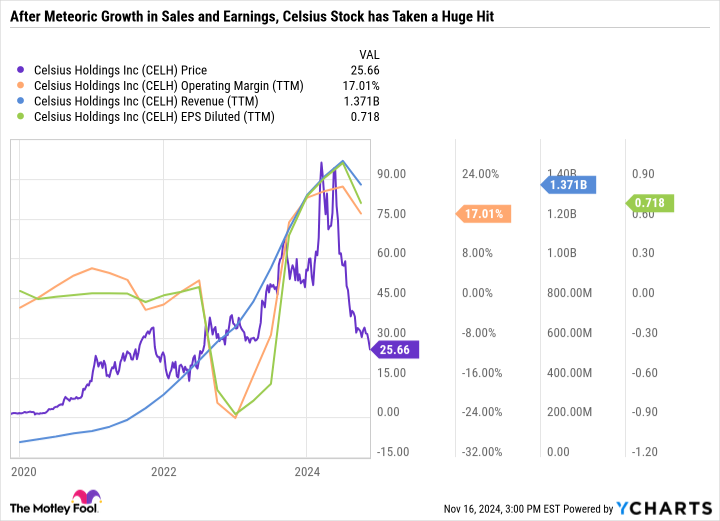 Celsius' stock crashed because its growth rate proved to be unsustainable. To quote the company's third-quarter presentation, "In the past 3 years, Celsius has grown 2.3x more volume than Red Bull, Monster, Alani, and Rockstar combined." Celsius was able to penetrate a highly desirable market while growing sales and profits.