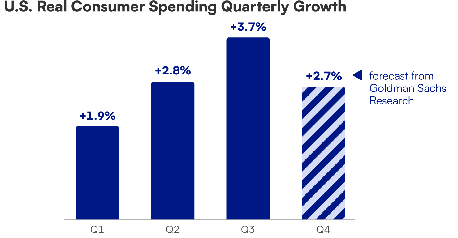 Defying predictions of consumer caution, economic data in 2024 consistently exceeded expectations.The U.S. economy expanded by 3.1% in the most recent quarter, fueled by consumer spending which surged 3.7% -- its strongest increase since early 2023. The services sector -- particularly restaurants and hotels -- emerged as a standout performer, indicating Americans maintained their appetite for dining out and travel despite economic pressures.