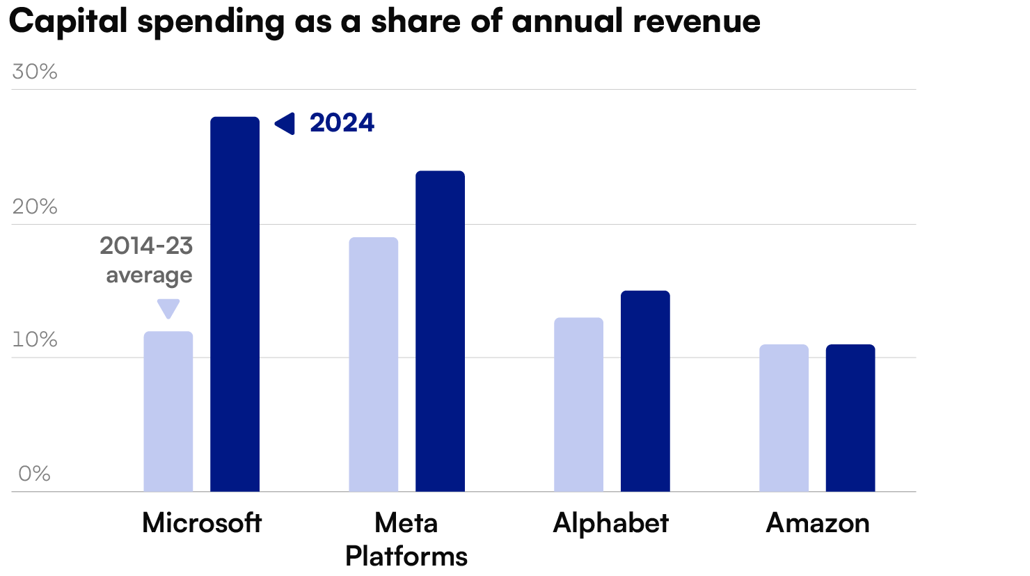 Tech giants bet unprecedented sums on AI in 2024. Meta Platforms (META +0.15%), Alphabet (GOOG 0.56%), Amazon (AMZN +1.05%), and Microsoft (MSFT +1.98%) are projected to invest a combined $200 billion in AI initiatives this year, an outlay that has helped push big tech's capital expenditure 56% higher through the first three quarters compared to 2023.