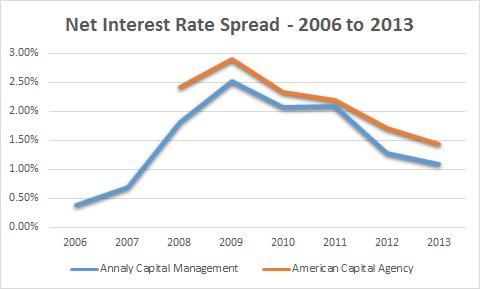 Mortgage real estate investment trusts (mREITs) Annaly Capital Management (NLY +0.99%) and American Capital Agency (AGNC +1.29%) use similar strategies to create those double-digit dividend yields shareholders love: Borrow short-term, and buy longer-term securities, earning the difference between what it costs to borrow, and the yield on securities. This is referred to as the net interest rate spread.