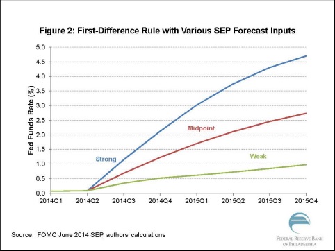 With that said, Plosser has constructed a chart (below) using a series of complex economic models that predict -- as long at the Fed stays true to its targets -- how interest rates may be adjusted based on economic progress. The blue line suggests the "best case scenario" for economic recovery, green is weakest improvements, and red represents the Fed's midpoint projections.