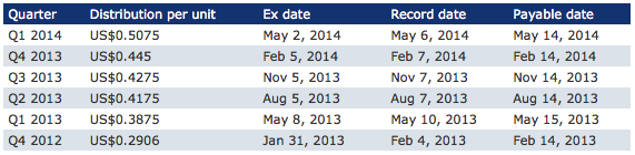 Seadrill Partners also offers growth prospects because of its right to purchase any drilling rig in Seadrill Ltd's fleet that is awarded a contract of at least five years in length or longer. Even though Seadrill Partners may not receive all of the cash flow generated by a purchased rig, depending on which operating company actually purchases the rig, it will still receive some, allowing the company to increase its distributions to investors. In fact, Seadrill Partners has a history of strong distribution growth.