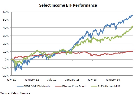 While partnerships have lagged stocks in the goldilocks environment of late, risk-adjusted returns are nearly identical. The chart below compares the performance of the Alerian MLP Fund against the SPDR S&P Dividend Fund (NYSEMKT: DVY) and the iShares Core US Aggregate Bond Fund (NYSEMKT: AGG).