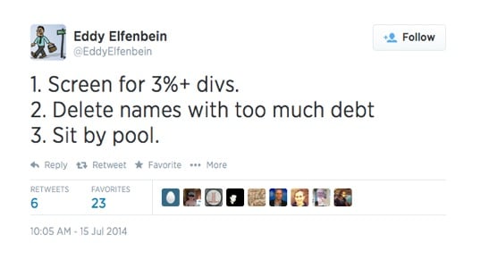 You know you have found a pretty simple investing process when the whole thing fits inside a single tweet. Eddy Elfenbein distilled a pretty interesting investment screen into less than 140 characters when he tweeted: