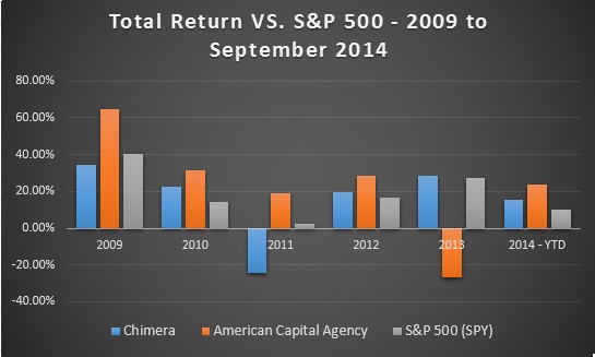 My opinions of the management team at American Capital Agency are quite the opposite. President and CIO Gary Kain, does a fantastic job clearly explaining even the most complex mREIT strategies, his foresight and expertise helps to keep the company ahead of the curve, and has lead the company to outperform both Chimera and the S&P 500 four of the last five years -- and is also currently beating the market.