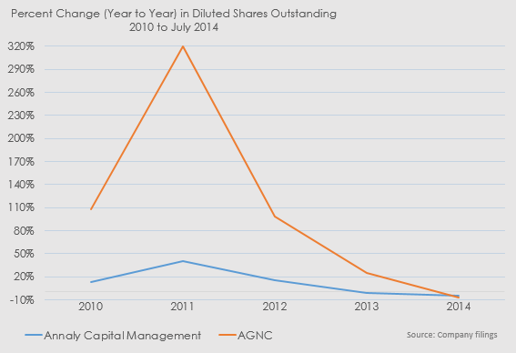 With that said, when issuing shares was in everyone's best interest, 2010 to the end of 2012, share count grew. However, as Annaly and American Capital Agency slipped below book value the selling of shares came to an immediate halt. In fact, in the first two quarters of 2014, Annaly and American Capital Agency's total shares declined 5% and 7%, respectively.