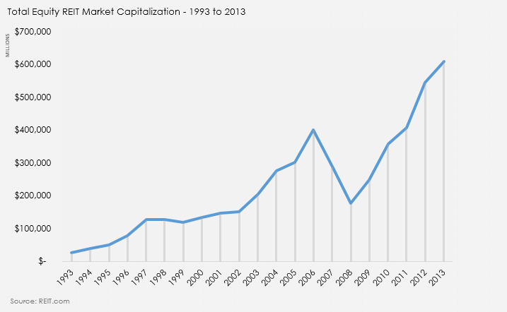 As shown in the chart above, equity REITs -- companies that invest in physical properties -- have been consistently strong over the past decade. In fact, despite the financial crisis from 2007 to 2009, equity REITs' collective market cap is up more than 2200% since 1993.